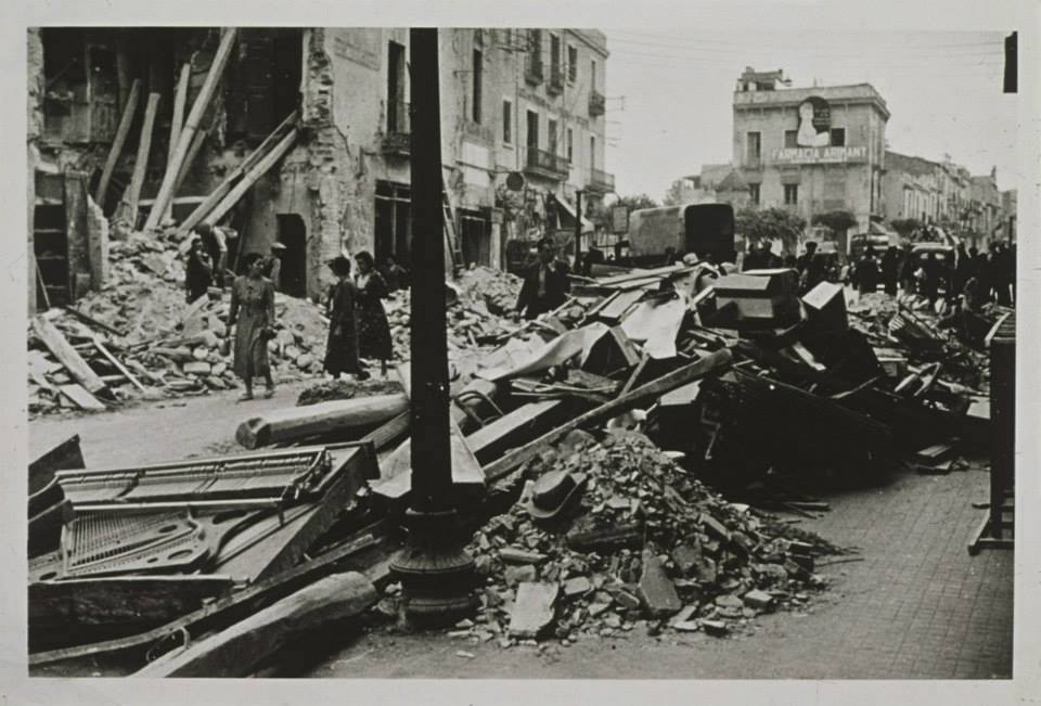 (foto: Efectes del bombardeig al carrer d’Anselm Clavé i a la pl. Maluquer. Biblioteca Nacional España)