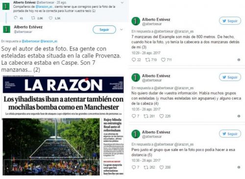 A ello, además, lo unieron a más descalificaciones a los Mossos, a Colau, a Puigdemont…a todo lo que se movía. Del “todo es ETA” se pasó a “todo es independentismo, o sea, yijadismo. Manipulación pura y dura hasta denunciado por el propio fotógrafo autor de la foto de La razón, por ejemplo: