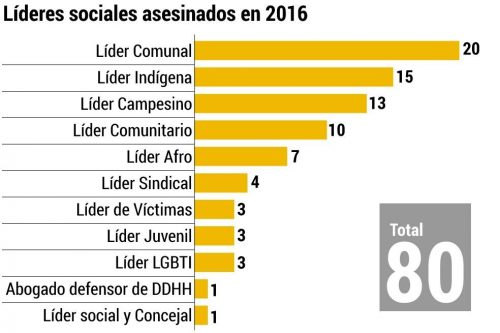 Son 17 asesinatos más que en 2015, en un país donde la guerra se supone que ha terminado. Así lo señala el último informe de Somos Defensores. Un asesinato cada 4 días de un líder popular, según este informe presentado ayer 22 de febrero al Gobierno Nacional y a la comunidad internacional