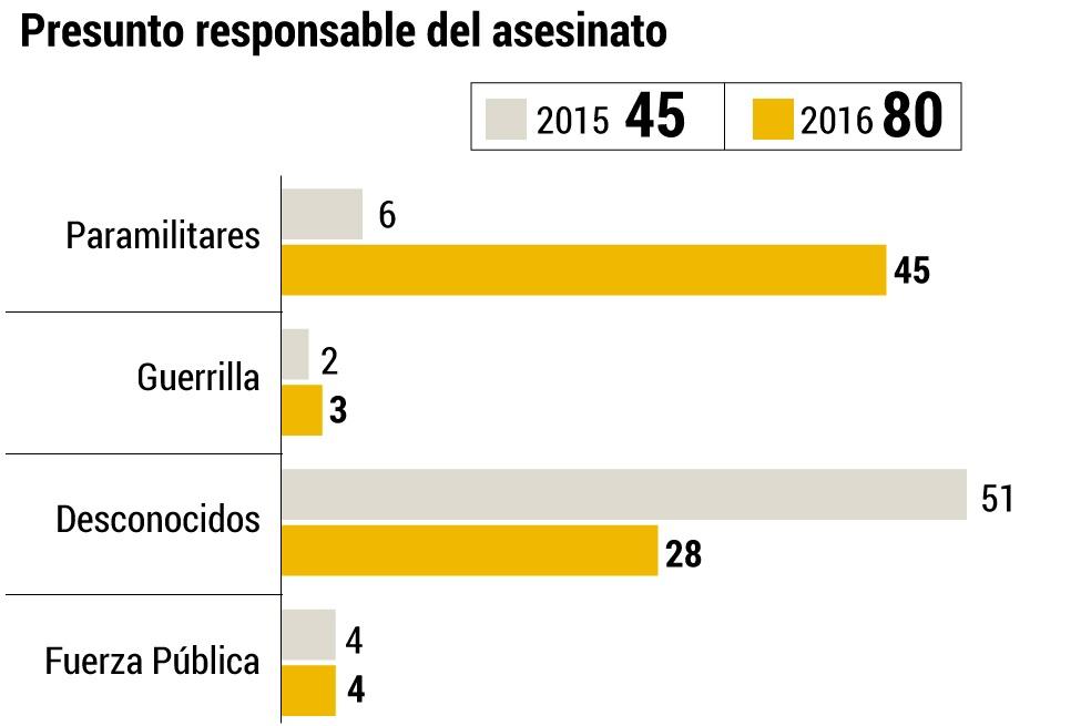 Son 17 asesinatos más que en 2015, en un país donde la guerra se supone que ha terminado. Así lo señala el último informe de Somos Defensores. Un asesinato cada 4 días de un líder popular, según este informe presentado ayer 22 de febrero al Gobierno Nacional y a la comunidad internacional