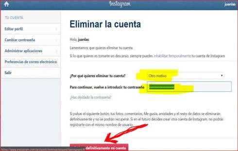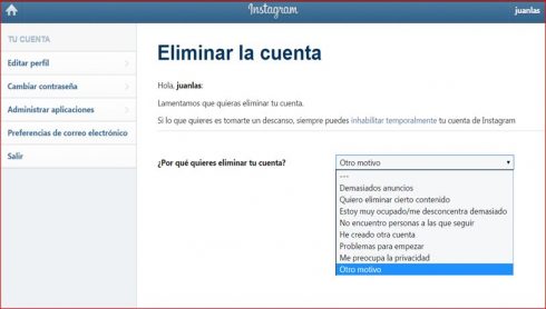 Por defecto, eso podemos saberlo todas, Instagram nos deja “SUSPENDER TEMPORALMENTE”. Pero….Qué pasa si lo que quiero es borrarla permanentemente de una vez por todas?, ¿cómo lo hago?