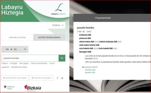 El Labayru hiztegia traduce palabras de euskera a castellano y viceversa pero también tiene una opción de traducir “frases hechas”. Como puedes ver en este ejemplo, la frase “pasarlo bomba”