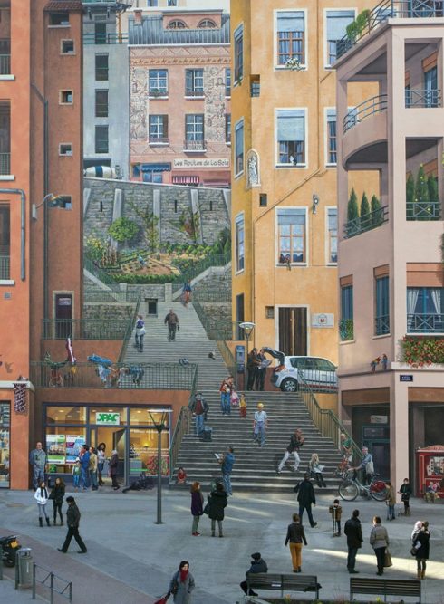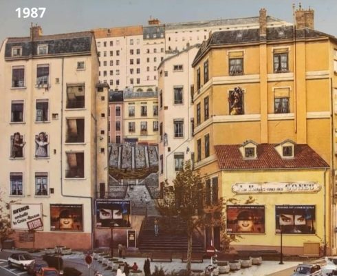El año 1987 el colectivo realiza el mural con una perfección y realismo que lo hace desde el inicio uno de los lugres más fotografiados y visitados de la ciudad. Ese año se ven las escaleras del barrio con una profundidad pictórica impresionante, los edificios antiguos con piso muy altos para poder albergar los telares, teatro de guiñol típico lyonés en diversas ventanas, como un guiño a la ciudad… El mural lo realizaron, además, con la colaboración de muchos de los residentes del barrio. Dibujaron el barrio en ese momento en que se pintó, con personajes del propio barrio y las casas y actividades propias.
