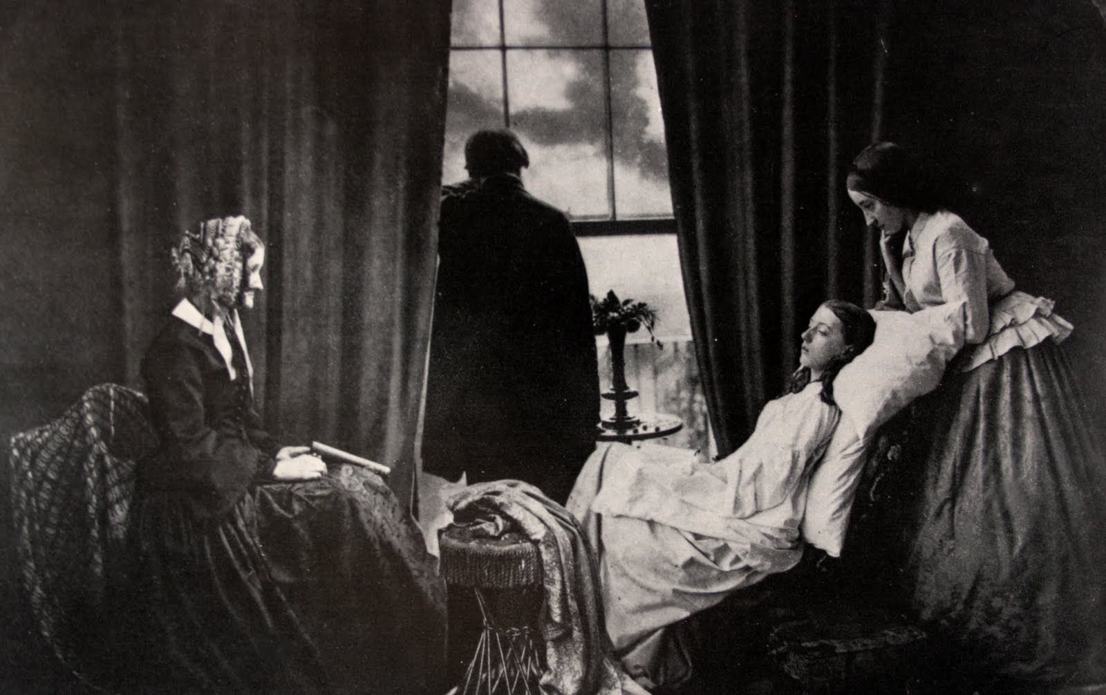 El otro fotomontaje, del mismo año 1857 o 1858, es de Henry Peach Robinson, una foto con 5 negativos diferentes que se acoplan la perfección. La foto se llama “Los últimos instantes”, mediante la técnica del el colodión húmedo, en la que se ve a una mujer a punto de morir en plena juventud ante la impotencia de su familia allí presente.