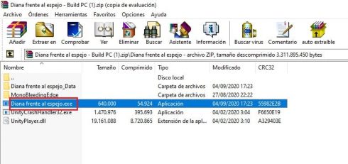 4.- Se abre la carpeta y salen diversos archivos y carpetas, haz clic en el ejecutable del videojuego “Diana frente al espejo.exe”