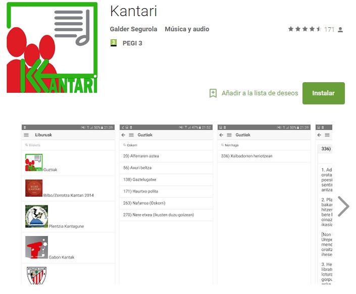 Otras Apps similares: LIBURUKANTA (Aunque sólo tiene letras de unas 90 canciones y sin vídeos. Eso sí, la búsqueda por tecla de alfabeto es muy chula) y GABON KANTA (unas ventialgo canciones de navidad, sólo las letras)