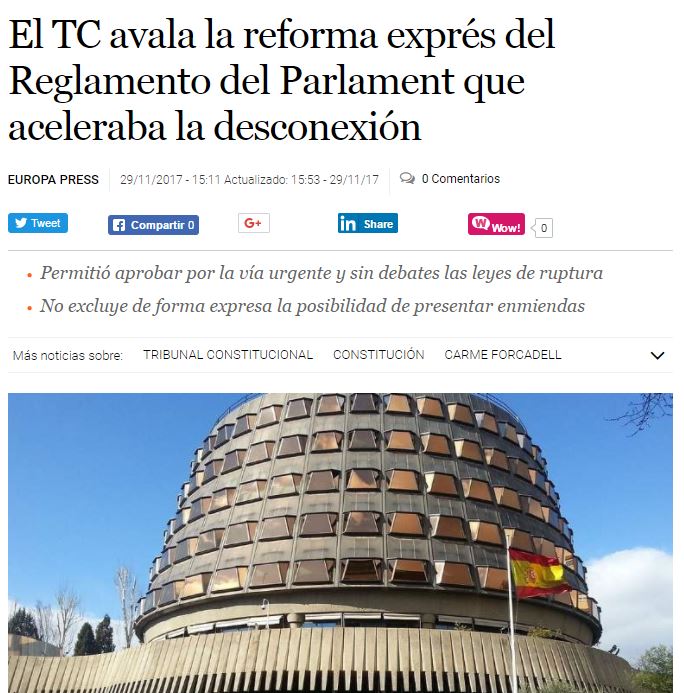 La cuestión es que ese artículo suspendido por el TC es el que permitía legalmente aprobar en el Parlament la ley del referéndum y las posteriores leyes de transitoriedad. Además, el Tribunal constitucional, tras suspenderlo, lejos de darse prisa para resolver la denuncia del PP, y a pesar de lo obvia y fácil que tenía que haber sido su contestación, …..tarda y tarda en resolver…hasta ayer 29 de noviembre (si os acordáis….no hace nada, otras denuncias de leyes al tribunal Constitucional se han resuelto en unos días, pero para ésta no había prisa…), a esta forma de actuar también debiera llamarse prevaricación porque tardan tanto a sabiendas de que la decisión cautelar de suspensión producirá un efecto que no podrá subsanarse al no contestar con la urgencia necesaria.