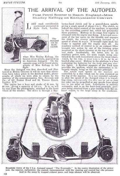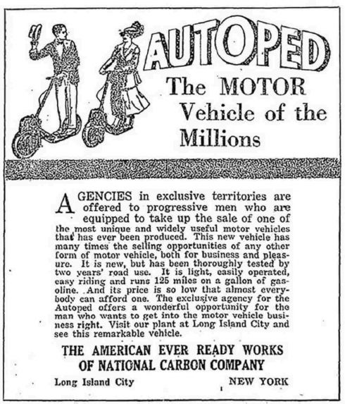 “Algo nuevo en el transporte”, para “los negocios y el placer”. Así se anunciaba en la época por parte de Autoped Company. Se anunciaba “ligero, fácilmente manejable” y que recorría “125 millas con 1 galón de gasolina”. Se vendía por 100 dólares, que era mucho dinero en esa ápoca. Además, eran plegables.