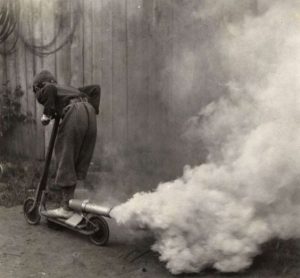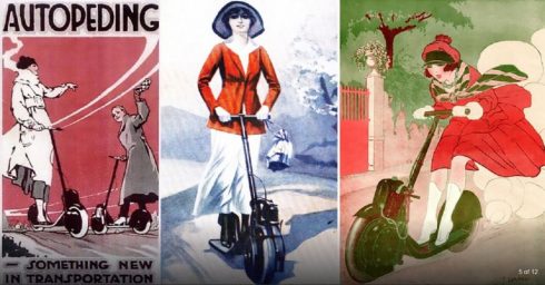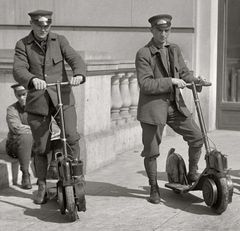 Pero…, a lo que iba, esto de los patinetes autopropulsados o estos scooters de pie que parece tan moderno….tiene ya bastante más de 100 años. No quiero hablar de motos tipo scooter, aunque algunos patinetes ya sean más eso que otra cosa, ni de bicicletas o monociclos con motor, ni de patines de ruedas individuales…….pero está claro que en muchas partes de la historia, las cuatro cosas se confunden.: