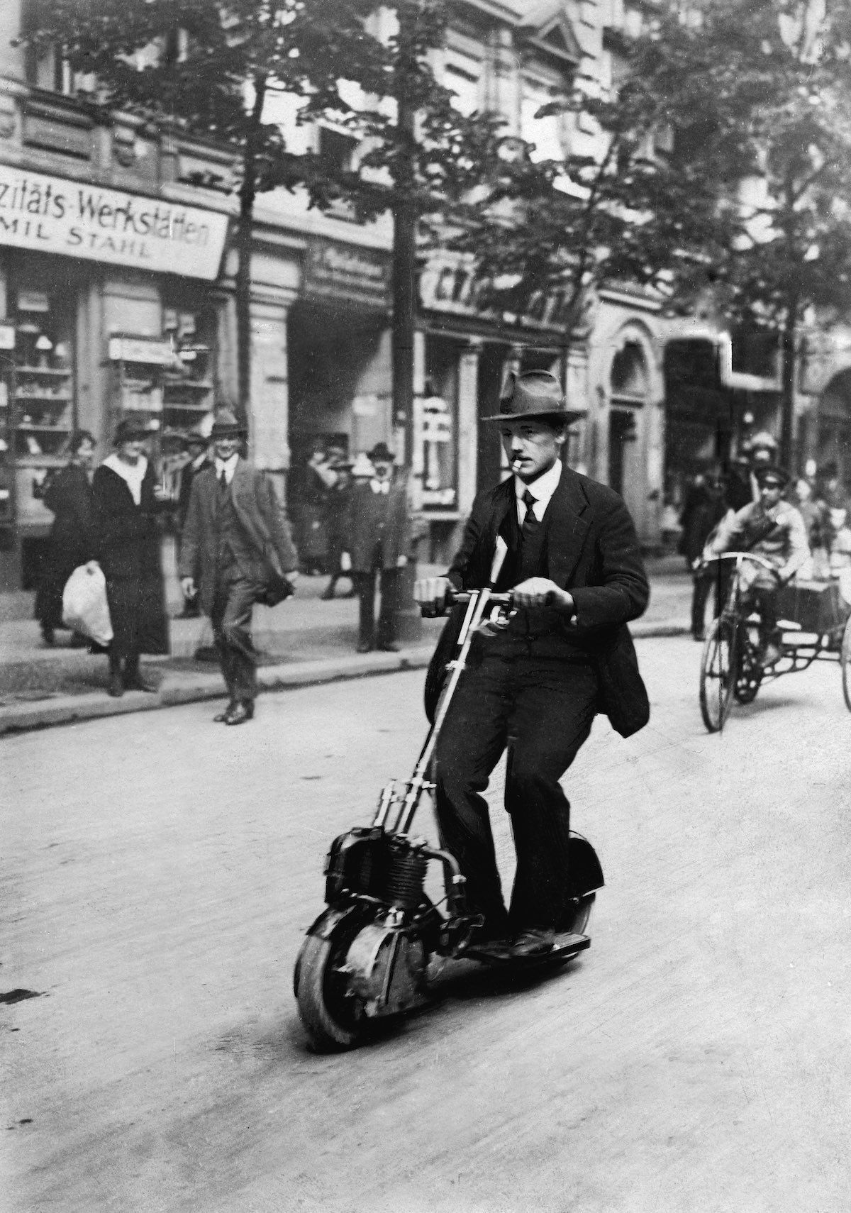 Un autoped de los últimos, plegable pero pesado, por las calles de Berlínen1925.