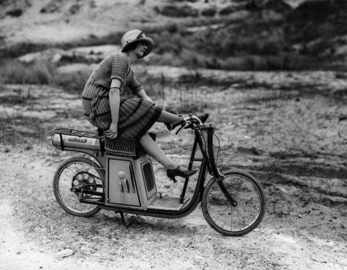 Una de las fotos más famosa de patinetes de esta época es ésta, que ha sido viral: Lady Florence Norman, una importante sufragista adelantada a sus tiempos, posando con el patinete Autoped de Krupp (es de gasolina aunque en muchos sitios he visto que hablan de “patinete eléctrico”, pero se ve el tubo de escape en la foto) en una calle en ese año 1916. En la foto Florence tenía 33 años y fue realizada en una calle de Londres por el fotógrafo Paul Thompson.Este es un patinete plegable convencional y ligero, en el año 1919 en París