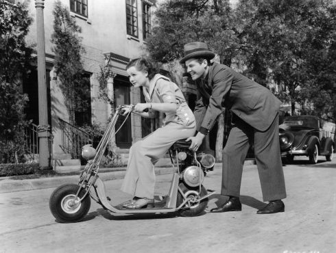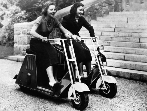 Eso sí, los modelos que se construían eran cada vez más avanzados y más evolucionados: modelos plegables; con mejores frenos, con luces, con suspensión…y más maniobrabilidad. Empezaron a utilizarse para moverse por las grandes instalaciones militares que había. Este es uno, un Scoot, eléctrico además, que se construyó en 1935 para moverse por aeropuertos. En la foto, la aviadora Amelia Earhart Putnam y una alumna, June Travis. (foto Bettmann / Corbis)