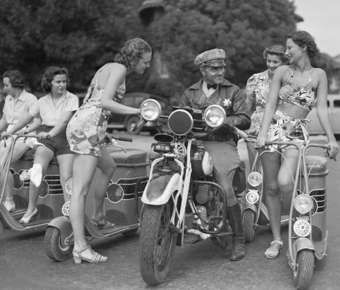 En esta foto, de 1937, una graciosa escena en California donde se ve al oficial de tráfico Leo Brandt haciendo además de sacar multas para todas las chicas que iban en sus patinetes-scooter por correr más de la cuenta . Dos de las chicas son Dorothy Armstrong, primer plano a la izquierda, y Peggy Marx (foto Bettmann / Corbis)