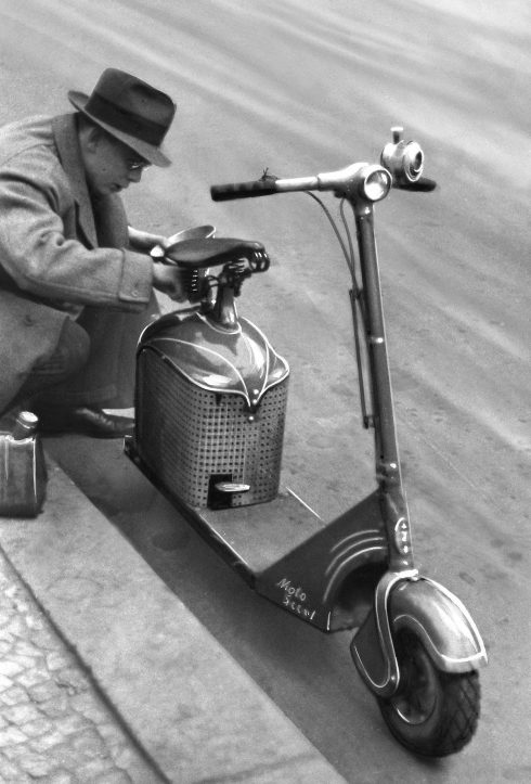 1938. Alemania. Cargando de gasolina un patinete «moto scool»