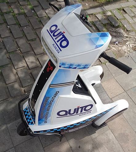 Ahora mismo ya tenemos patinetes chinos, de Xiaomi por ejemplo, que pesan menos de 12 kilos y son capaces de absorber la energía cinética para transformarla en energía, y con metales aún menos pesados. Los patinetes de 3 o 4 kilos están al caer. Hay ya muchos, como este dela foto, que son utilizados por polícías, en este caso en la ciudad de Quito: