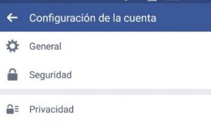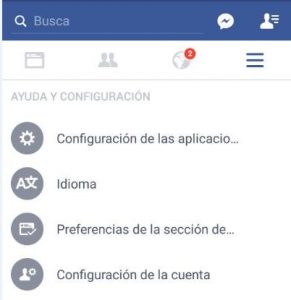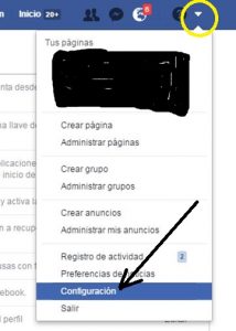 1.- Si es un PC, pulsas en la flecha superior derecha de facebook (círculo amarillo) y escoges «Configuración». Si es un móvil android, pulsas en las tres rayas de la parte superior derecha y luego pulsas en «Configuración de la cuenta»
