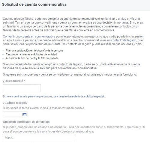 Para solicitar que una cuenta se convierta en conmemorativa hay que solicitarlo a Facebook, PULSA EN ESTE ENLACE y te saldrá una pantalla como esta o similar